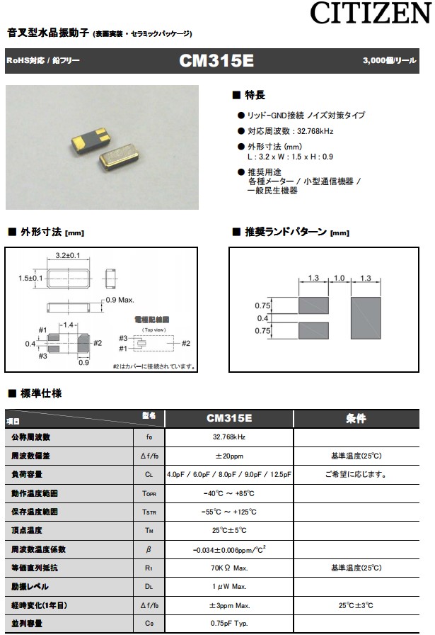 | CM315E32768DZFT | Citizen Crystal | CRYSTAL 32.768KHZ 12.5PF SMD | CM315E | 32.768kHz |