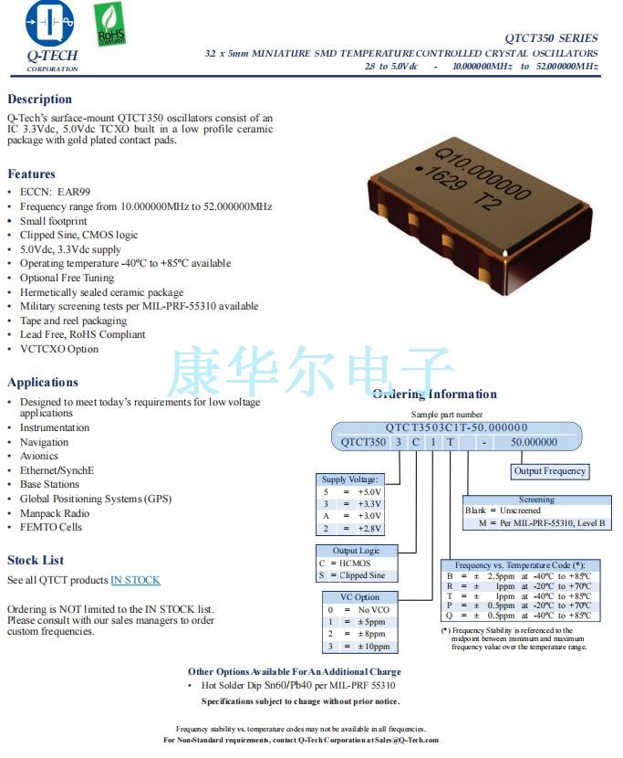 Q-Tech晶振,QTCT350晶振,QTCT3503C1T-50.000000晶振 温补晶振即温度补偿晶体振荡器(TCXO),本身具有温度补偿作用,是通过附加的温度补偿电路使由周围温度变化产生的振荡频率变化量削减的一种石英晶体振荡器,高低温度稳定性:频率精度0.5PPM~2.0PPM,常用频率:26M,33.6M,38.4M,40M.因产品性能稳定,精度高等优势,被广泛应用到一些比较高端的数码通讯产品领域,GPS全球定位系统,智能手机,WiMAX和无线通信等产品,符合RoHS/无铅.